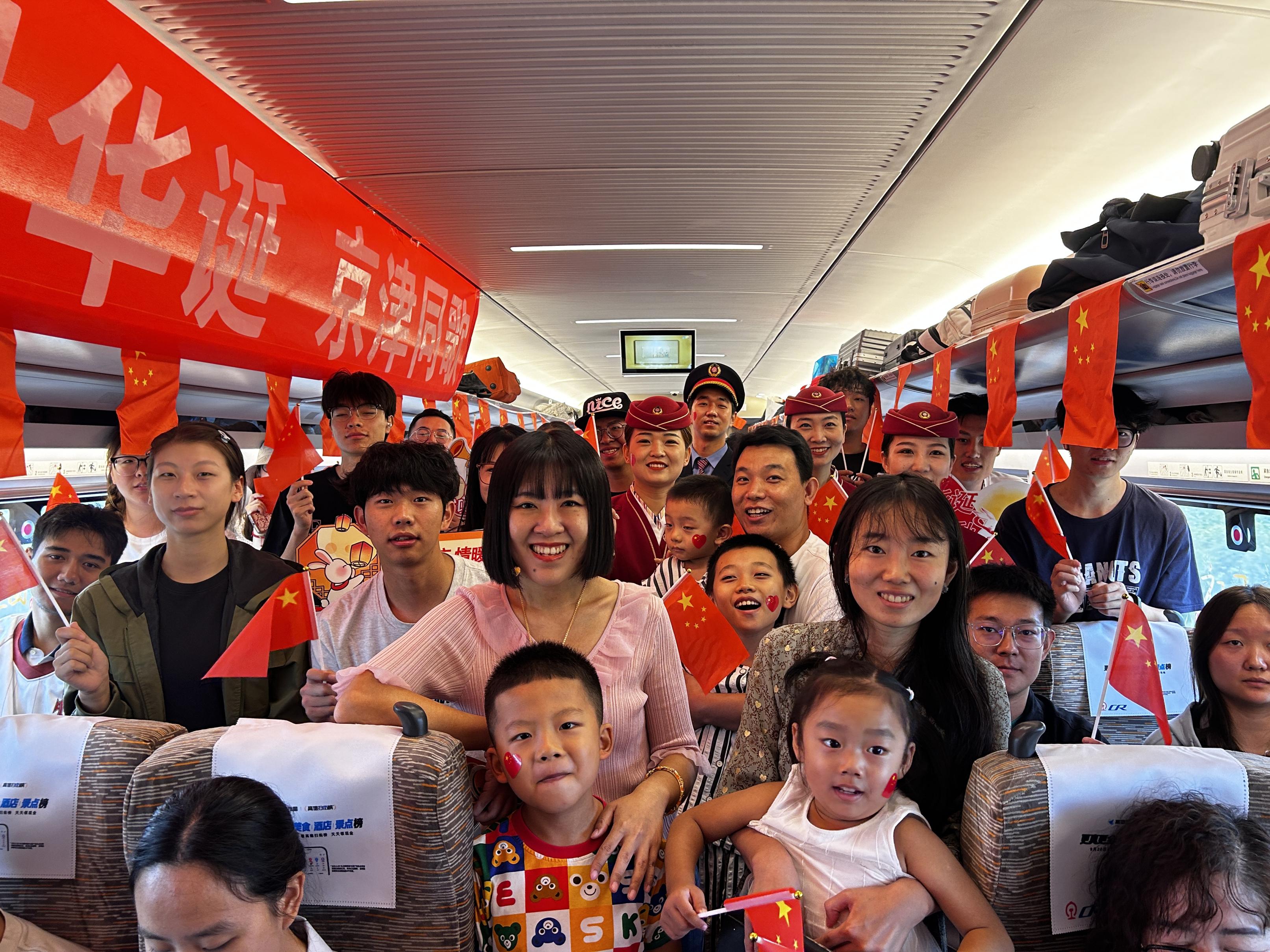 登上高铁列车,还能偶遇丰富多彩的列车活动。“今天是祖国的生日,诚邀各位旅客与我们一起唱响《歌唱祖国》,向祖国致以祝福!”10月1日,在天津开往北京南的C2218次列车上,随着工作人员手持小国旗向旅客发出邀请,熟悉的旋律在车厢内奏响。领唱声音刚起,靠窗的大爷便跟着哼唱“五星红旗迎风飘扬”,紧接着,旅客们挥舞着手中的国旗纷纷加入,把对祖国的祝福融进歌声里。当最后一句“从今走向繁荣富强”落下,车厢内先是短暂的沉静,随即爆发出热烈的掌声。